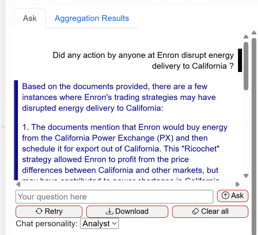 - Solution: Investigators will deploy Franklin’s “Ask” functionality to interrogate the enterprise documents broadly before engaging in more focused document search.